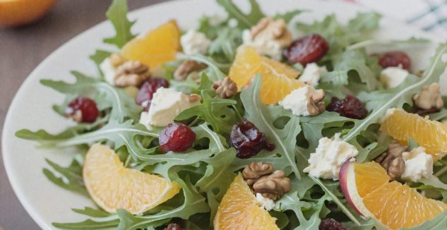 - Assemble the salad: In a large bowl, combine arugula, goat cheese, walnuts, cranberries, chopped apple, and mandarin slices.